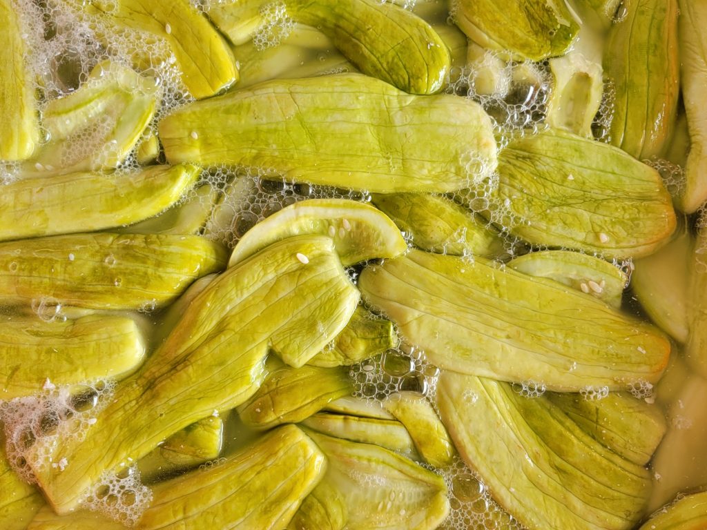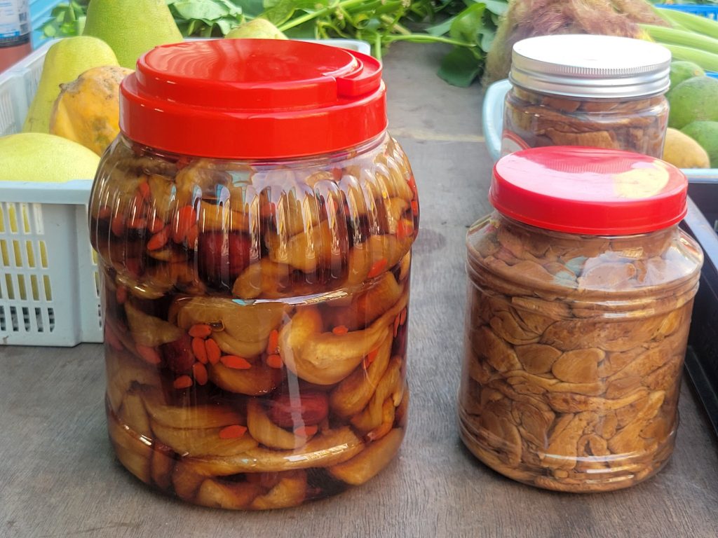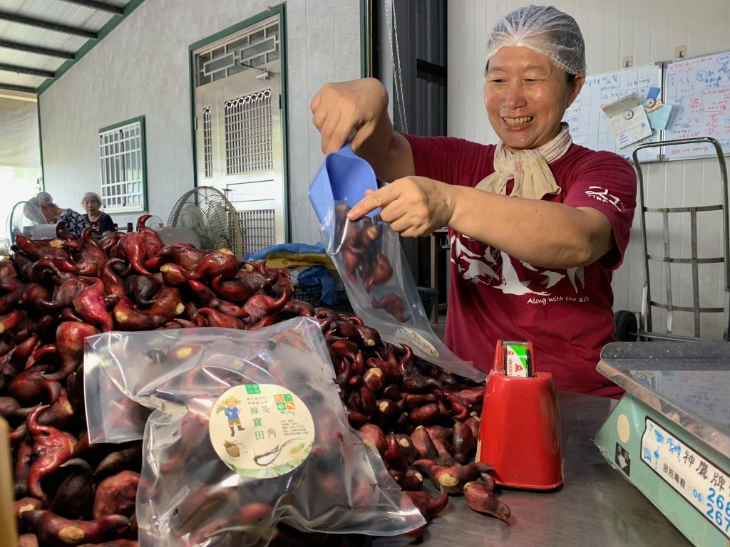 之前在市場裡拍攝的綠色膨風豆,阿嬤也是這麼闡述放置田間讓它自然成熟就會變黃,青豆味也會消淡轉為另一種風味的呈現,這概念跟毛豆變黃豆的成長歷程相似。我也認為這樣成熟變黃的豌豆比較符合府城人喝的豆仔湯的味道,用青豆來處理實在太耗時也不符合邏輯。目前坊間吃到的黃色膨風豆大部份皆由進口的黃豌豆泡發,這點曾在屏東六堆的鄉鎮逛過幾場菜市,當地人也說本地人不種,都是自己”發”的,指的就是泡發後再蒸煮而成。